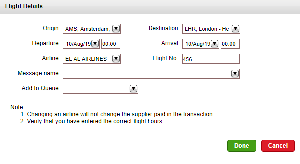 In the Add to queue field, select the queue to which the travel file should be added after the flight details are change.