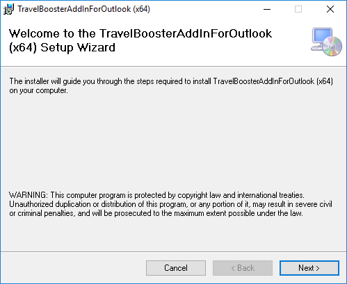 To install the Travel Booster Add-in, click Next until the add-in is installed and then close the wizard.