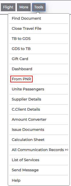 From PNR: This tool is used for importing the flight, hotel, and car reservation details from a PNR from any GDS into the system through an API. The system imports the most recent state of the PNR.