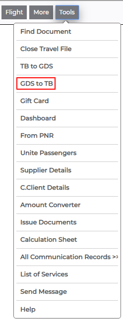 TB to GDS: This tool is used for exporting passengers to a GDS. When a user is making a reservation in the GDS, and the passengers exist in the system, the passengers can be exported to the GDS using this tool (including frequent flyer information), which prevents the creation of duplicate passengers when a PNR file is imported into the system. Supported for Sabre and Amadeus only.