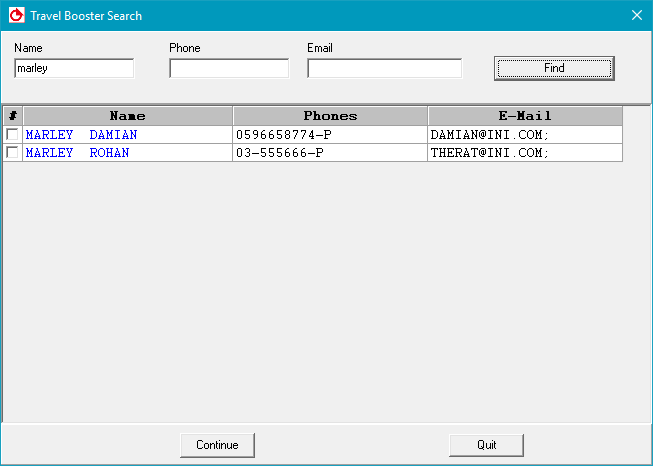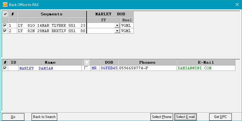 Clicking on these buttons opens a dialog box that allows you to search for existing passengers in the system. You can then select the correct passengers and add them to the PNR.