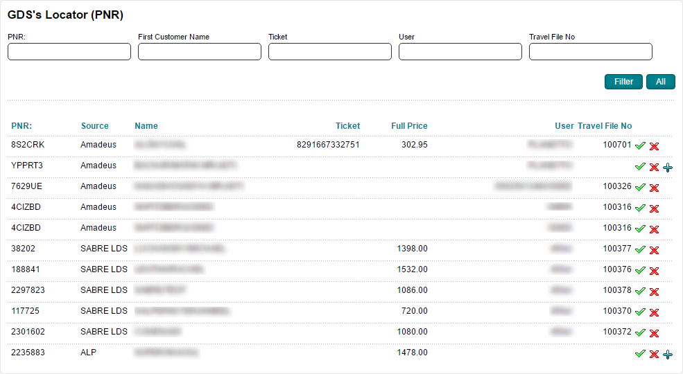 You can use the various fields to filter the results, or click All to view all PNRs imported into the system using GDS to TB.